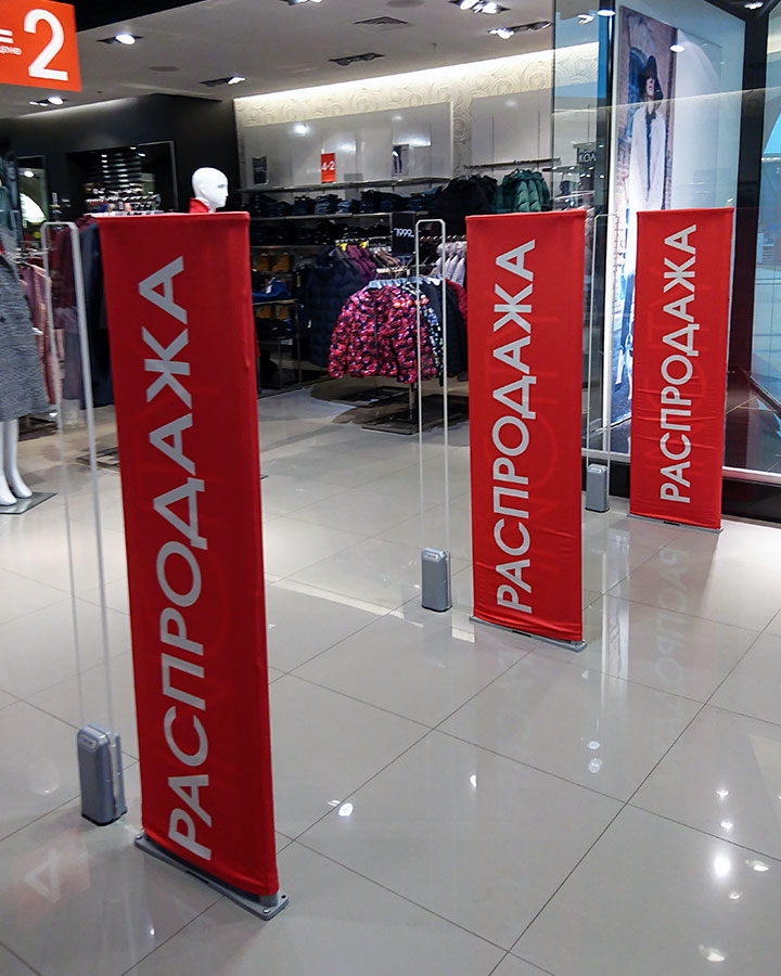 - Практически везде в залах торгово-развлекательных комплексах, магазинах и супермаркетах используются антикражные ворота. Такие ворота устанавливаются для срабатывания сигнала тревоги, если товар не был оплачен на кассе. Но помимо своих основных функций, антикражные ворота могут использоваться в качестве рекламного носителя. Для этого цели наша компания предлагает чехлы на антикражные ворота, изготовленные из полиэфирной ткани с полноцветным рекламным изображением высокого качества, которое наносится на всю поверхность чехла методом сублимационной печати на ткани.